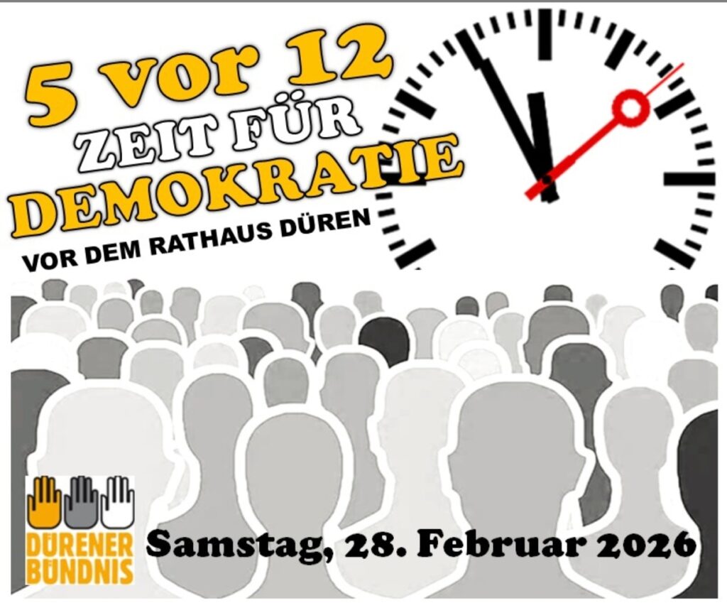 Unsere Veranstaltungen „Fünf vor zwölf – Zeit für Demokratie“ starten wieder ab 10.Mai.2025 um 11.55 Uhr auf dem Kaiserplatz in Düren